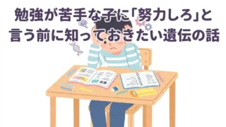 親が知っておきたい教育 勉強が苦手な子に「努力しろ」と言う前に知っておきたい遺伝の話 「何度言っても勉強しない」「努力が足りないの?」と悩む親へ。行動遺伝学の研究が示す学力と遺伝の関係、教科別の傾向、そして今日から家庭でできる具体的な対応策をわかりやすく解説します。 2019.01.18 親が知っておきたい教育